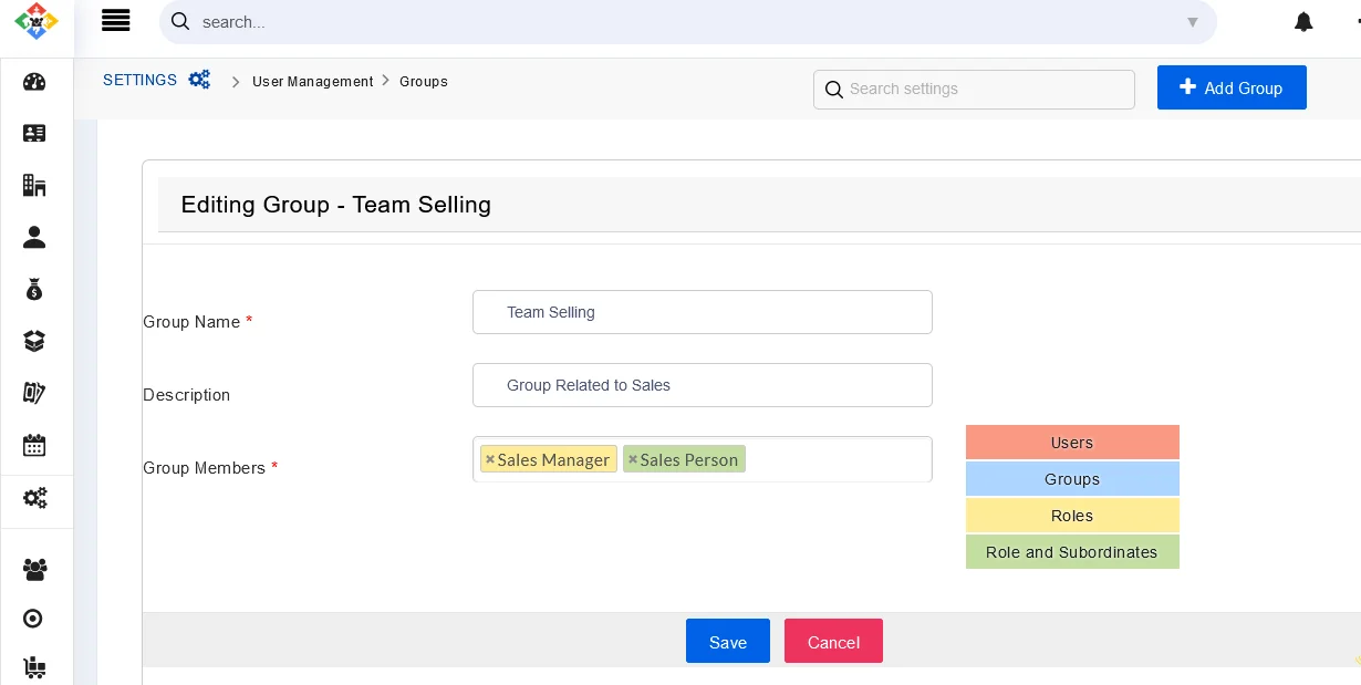- Click on the Left SideBar → Settings → Navigate to the User Management section → Groups → Add Group