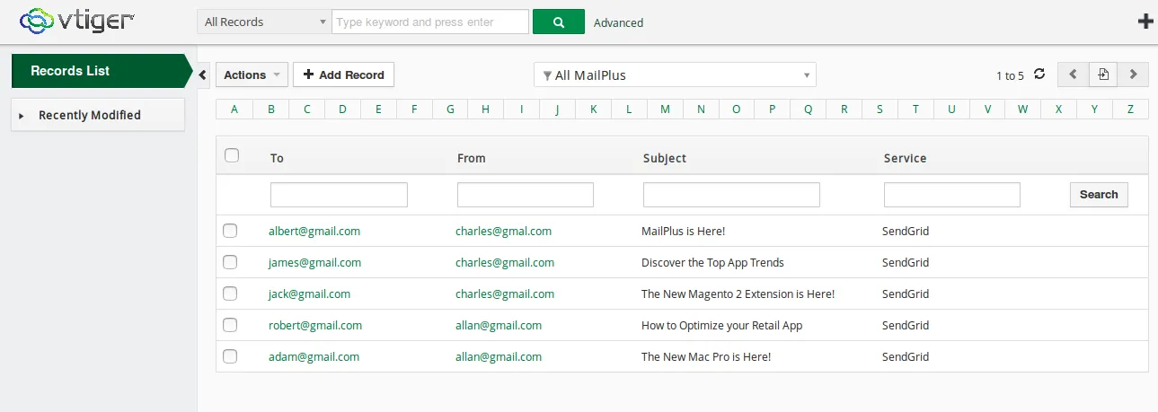 • Manage email records with Mail Plus for VtigerCRM extension