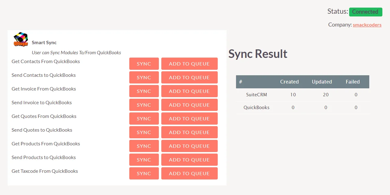 QuickBooks SuiteCRM Integration connects the accounting platform bi-directionally with CRM. Simplified sync of your Products, Contacts, Invoices, and Quotes between QuickBooks Online and SuiteCRM. SuiteCRM for QuickBooks is the best CRM for QuickBooks online. The extension allows performing secured sync instantly and on schedule. The scheduled sync allows multiple sync processes to align in a queue and get triggered later.