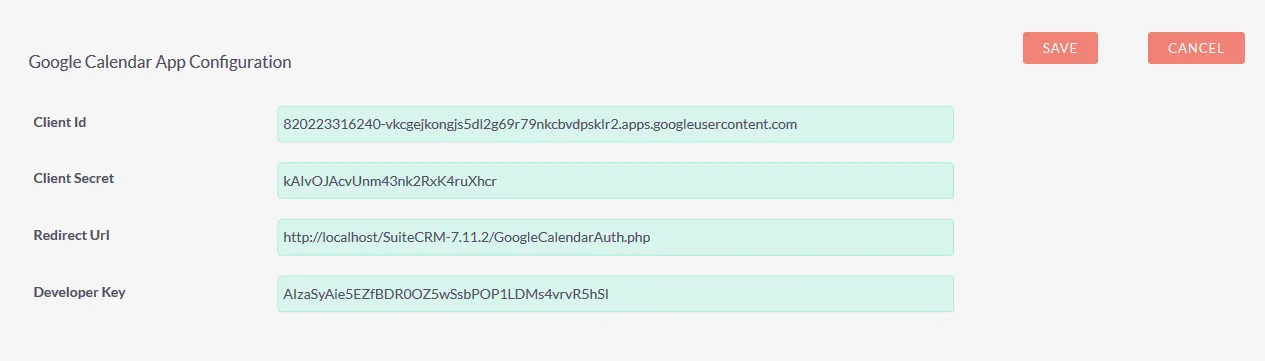 Enter your client ID and client secret on the configuration tab to ensure a safe and secure connection between your SuiteCRM and Google Calendar