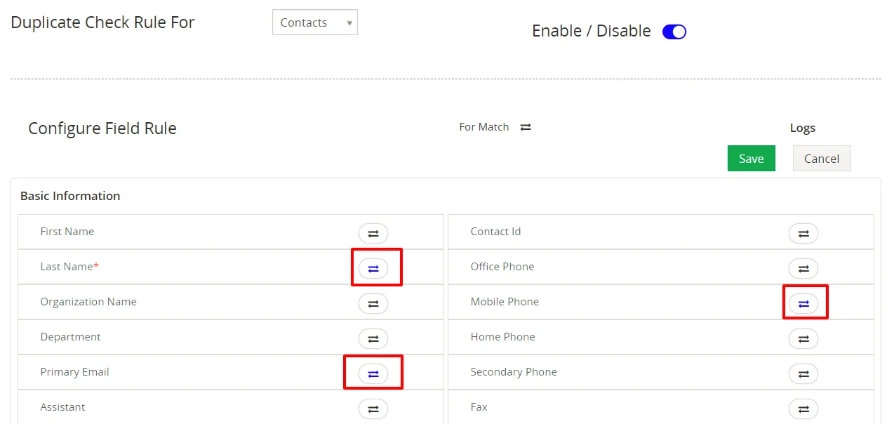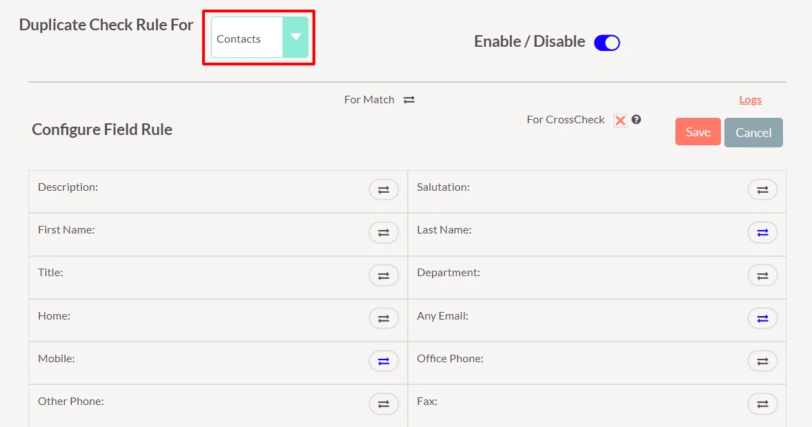 Choose unique fields from the whole stack of CRM fields to check for duplicates.