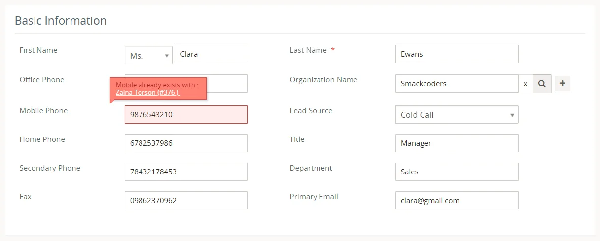 • Vtiger Duplicate Check detects duplicates with same customer information of Email and Phone in Lead, Contacts and Organization.